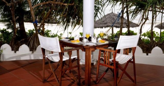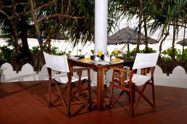 Das Essen wird auf einer großen überdachten Veranda mit Blick auf den Strand und den Indischen Ozean serviert. Zur Auswahl stehen europäisch inspirierte Gerichte die mit lokalen Zutaten und Gewürzen abgerundet werden und typisch sansibarische Gerichte. Neben dem Restaurant liegt die gut ausgestattete Bar mit sehr gemütlichen offen gestalteten Sitzbereichen unter freiem Himmel mit Meerblick.
