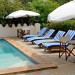 Der Pool liegt neben dem Hotelgebäude und bietet Sonnenliegen und Sitzgelegenheiten mit Sonnenschirmen.